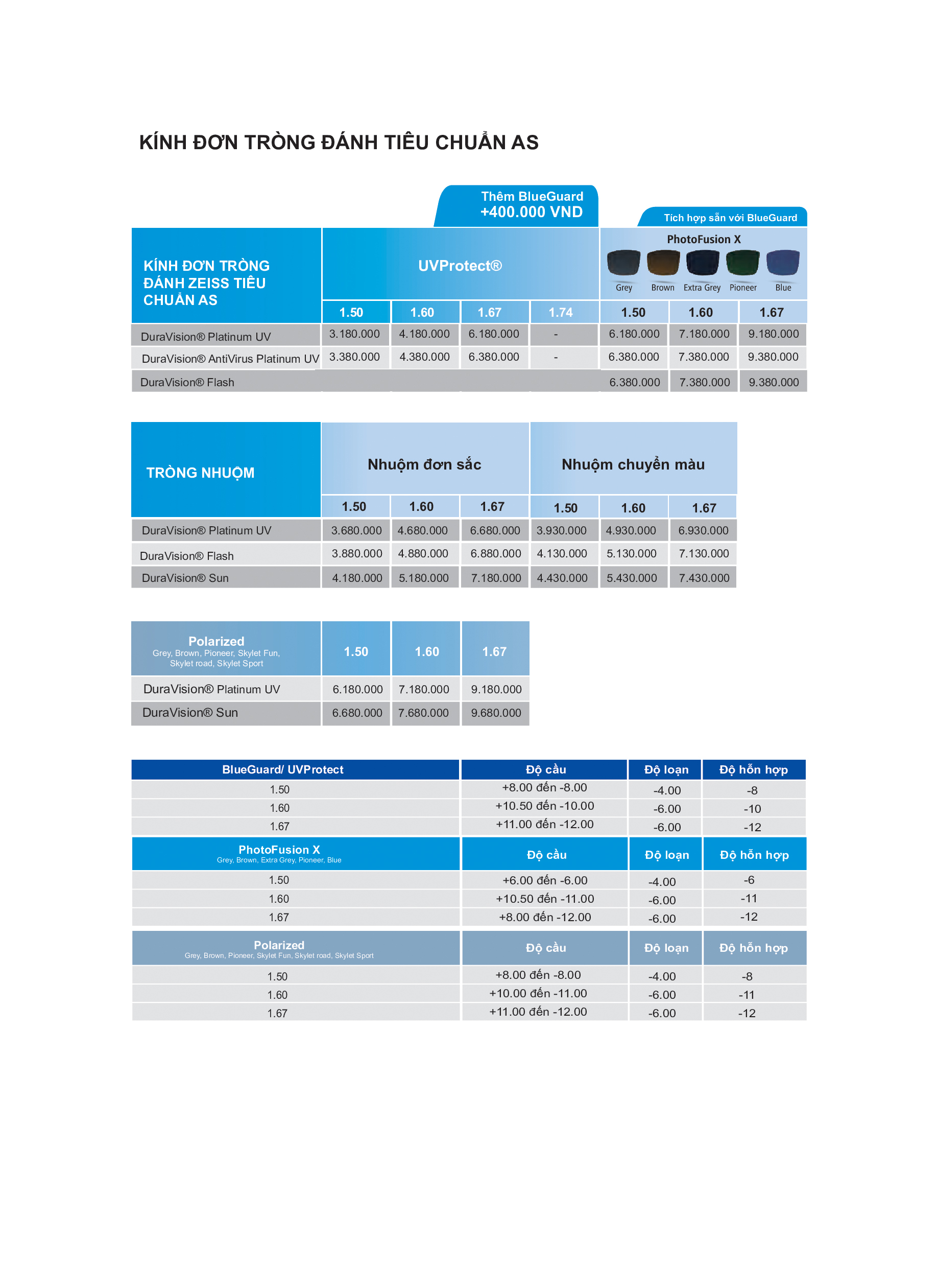 Kính Đơn Tròng Đánh Nhuộm Màu ZEISS DuraVision Platinum UV Tiêu chuẩn (AS) Đơn Sắc